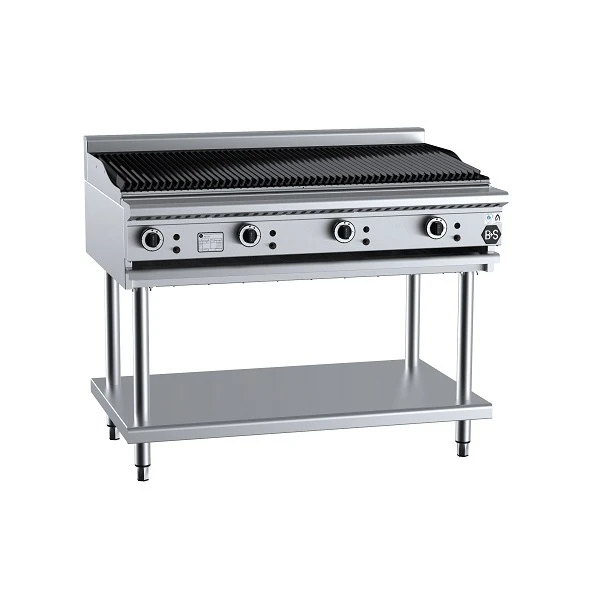 The B+S Black series char broiler is mounted on an open stand with an under shelf ideal for storing cooking utensils. The cooking surface consists of heavy duty cast iron grates with special drainage channels, which direct fat to the grease trough located at the front of the unit. A cast-iron hood placed above the 33 Mj burners radiates heat evenly across the grates, creating an ideal surface for grilling.