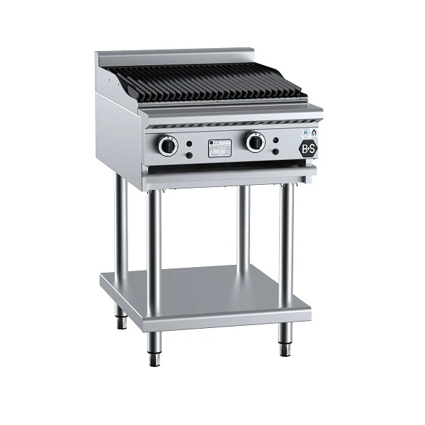 The B+S Black series char broiler is mounted on an open stand with an under shelf ideal for storing cooking utensils. The cooking surface consists of heavy duty cast iron grates with special drainage channels, which direct fat to the grease trough located at the front of the unit. A cast-iron hood placed above the 33 Mj burners radiates heat evenly across the grates, creating an ideal surface for grilling.