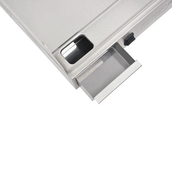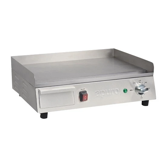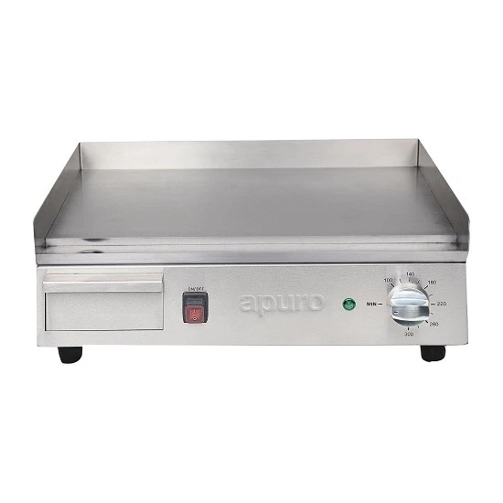 This compact griddle from Apuro may be small, but it always delivers a big performance. The 520 x 330mm cooking surface is heated by a powerful 2.2kW element that guarantees fast heat-up times and an even distribution of heat across the steel plate.With a simple ON/OFF switch and accurate dial temperature controls, operation couldn’t be easier. You just need to season the plate, and start cooking! This electric griddle is small enough to fit on your countertop, but don’t be worried about making a mess – a removable fat collection drawer will keep your surfaces clean, and save you loads of time when it comes to cleaning and maintaining it.