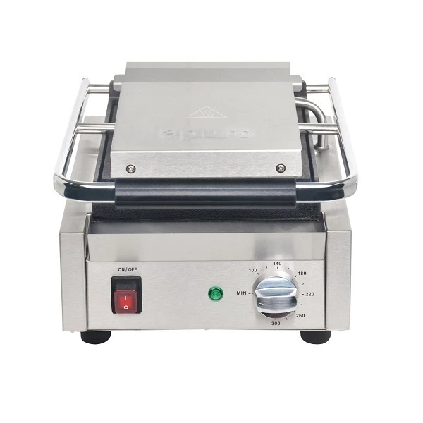 A powerful and effective grilling solution for professional caterers. With up to 1.5kW of cooking performance, using this Apuro bistro single contact grill makes it easier than ever to serve anything from sumptuous steaks and burgers to deliciously tempting paninis. The heavy duty cast iron grill plates are perfect for everyday use, and provide the ideal non-stick cooking surface when seasoned. Simple to use, clean and maintain.