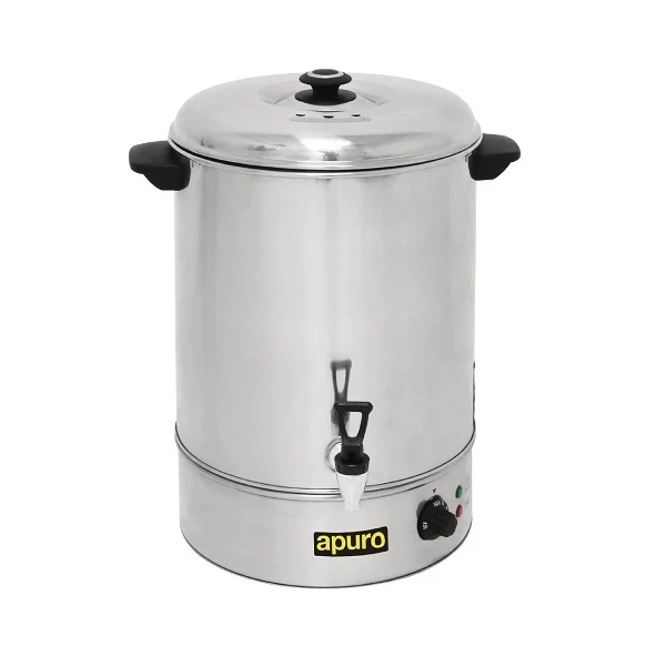 The manual fill Apuro 40 litre water boiler is a powerful and versatile appliance for professional catering businesses. Perfect for use by mobile caterers, B&Bs and staff rooms, the kettle is ideal for buffet-style breakfast service and businesses with limited access to mains water. The easy to clean, fully-welded stainless steel construction and the huge 40 ltr capacity ensures that the urn is strong, water-tight and large enough to serve many drinks without being refilled. With a powerful 2.6kW concealed element and variable temperature control, the Apuro commercial boiler can be used to keep water below boiling if required. Fitted with secure durable handles abd non-drip tap.