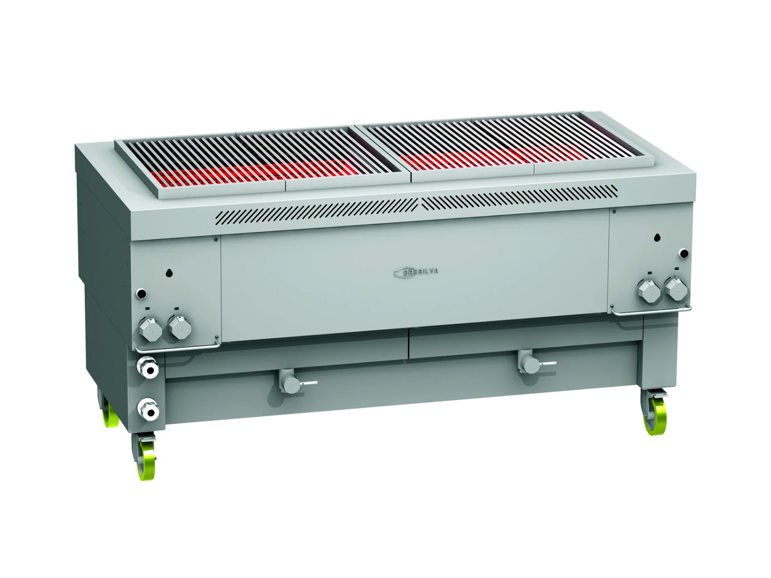 GRESILVA® – High heat in seconds using Powerful ceramic burners angled at 45 Deg. The water bath along with the high heat radiation gas burners produce a smokeless grilling option which is economical, practical, hygienic, and healthy way of cooking. The flameless burners provide the lowest CO2 emissions and generate the highest heat, resulting in succulent and appetizing grilled food without altering nutritional value and avoiding the production of benzopyrenes. The GHPI 4F/1700 is distinguished by its fixed grid grill with mega grilling surface of 1496mm x 607mm. It comes on a base complete with a auto fill water bath feed.