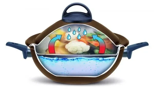 The multifunctional Vapsi for steam cooking consists of four parts with several functions: wok with two handles, tray with holes, fork and domed lid. The main function is steam cooking, but it can also be used for baking, heating, defrosting, cooking two different dishes at the same time, and more. The tray can also be used separately in the oven for pizza, biscuits, cakes, etc. for cooking. Made in Italy.