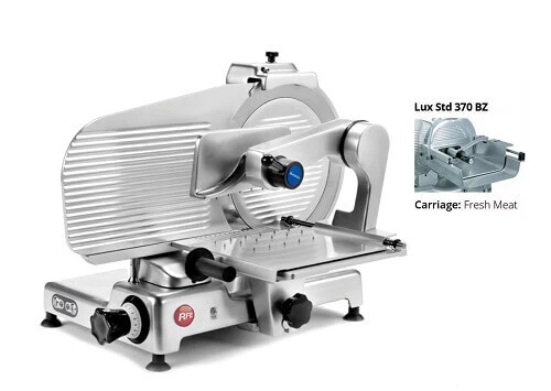 The Lux 370 meat slicer is a Medium Duty, vertical manual slicer suitable for bacon or even harder cured meats. An ideal slicer for supermarkets, butchers, delicatessen, large restaurants and catering facilities
