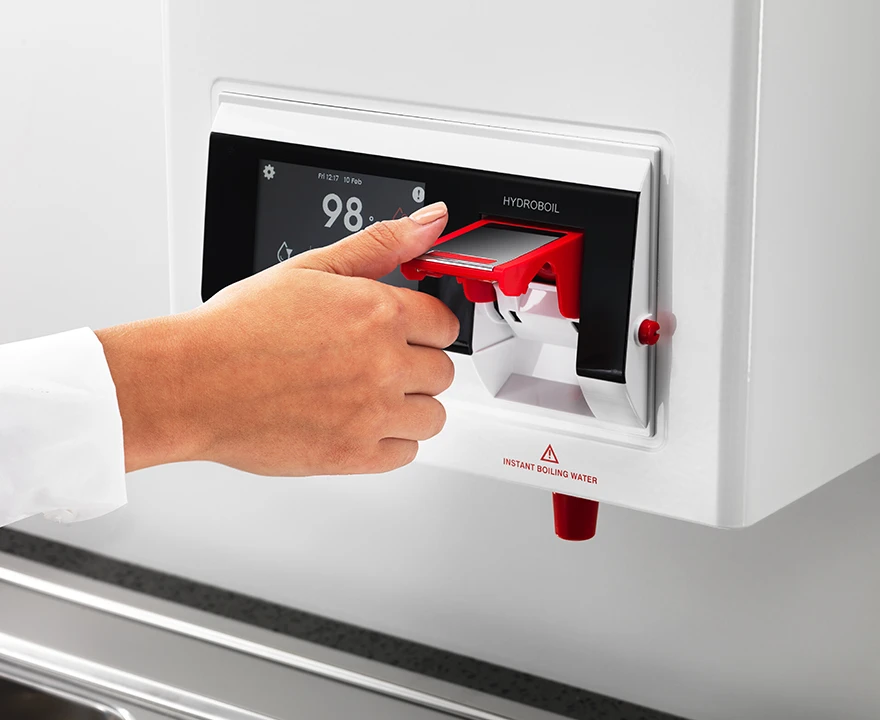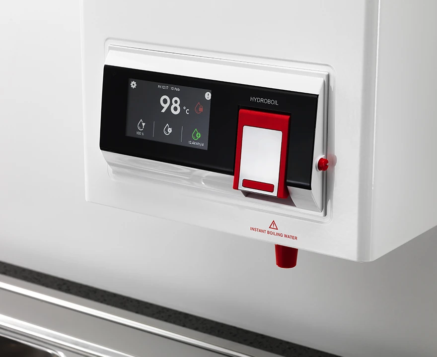 Wall mounted instant boiling water appliance with integrates 0.2 micron MicroPurity™ filtration. The Hydroboil® employs twin chamber boiling water steam-heat-boost™ technology to recycle energy from steam to pre-heat the incoming cold water. The Hydroboil® has inbuilt self-calibration technology, utilises highly accurate electronic temperature control, G4 energy management and recovery technology and incorporates a programmable digital touch-screen display with 3 energy saving modes. The main boiling water tank is constructed from the highest quality 444 grade Stainless Steel and wrapped with high performance insulation to ensure the healthiest water and optimum efficiency. The Hydroboil® is equipped with a two-way cool-touch safety tap.